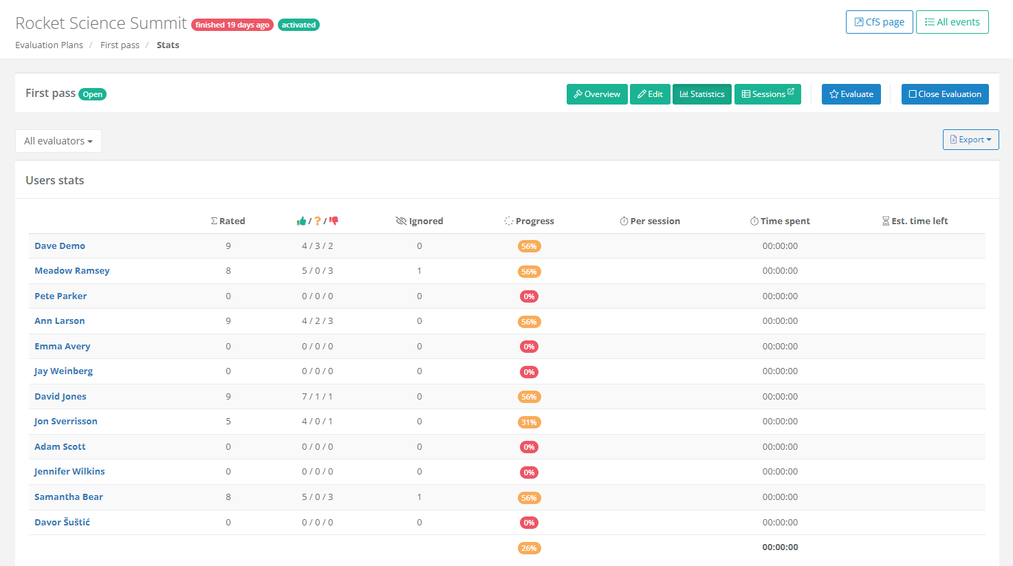 The Stars rating evaluation mode is possibly the most straightforward one. Your evaluators simply have to go through every session and rate it with 1-5 stars. Half-star ratings are also supported. Once they do that, you'll have a clear overview of which sessions have the highest rating and, as such, are the best choice for your event.