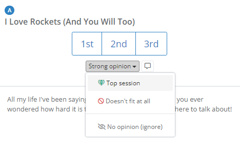 If they particularly like or dislike a certain session or have absolutely no opinion on some of them, they can use the Strong opinion option to express such views and further help the algorithm provide an accurate final rating, as well as speed up the evaluation process.