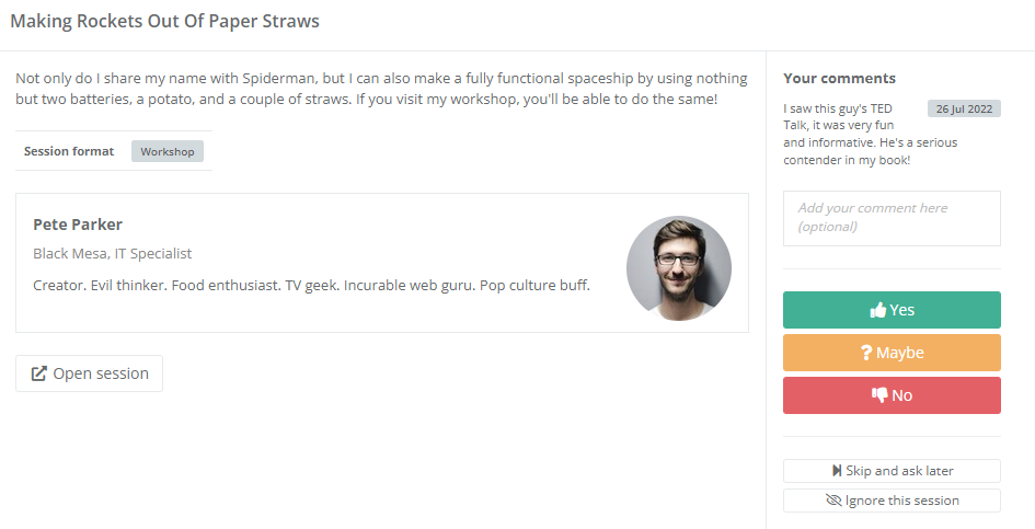 The Yes/No evaluation mode has your evaluators go through the submitted sessions one by one and pick between three options: Yes, No, or Maybe. They can also ignore the session entirely, should for any reason they feel unable to rate it properly.